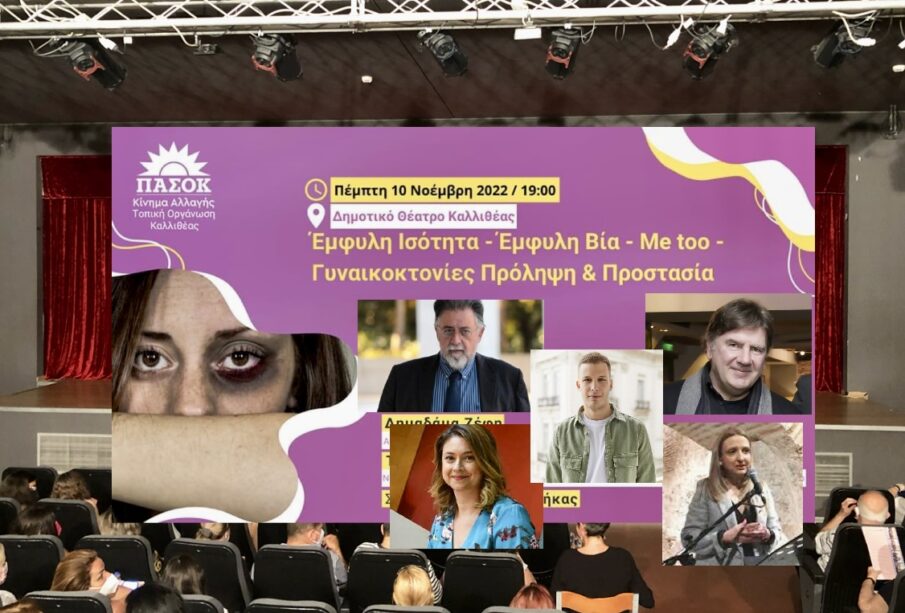 Πιο συγκεκριμένα απόψε, Πέμπτη 10 Νοεμβρίου 2022, στις 19:00 στο Δημοτικό Θέατρο Καλλιθέας (Κρέμου 123 & Φιλαρέτου) ο Καθηγητής Εγκληματολογίας και πρώην υπουργός Γιάννης Πανούσης, ο Διδάκτωρ Δημοσίου Δικαίου του Παντείου Πανεπιστημίου Βασίλης Μαστρογιάννης, η αντιπρόεδρος Γυναικών του ΕΣΚ (PES) και μέλος της ΚΠΕ του ΠΑ.ΣΟ.Κ. Δημαδάμα Ζέφη και η  Νομικός με ειδίκευση σε θέματα Έμφυλης Βίας και Ισότητας Τζιουβάρα Ελευθερία MSc Κοινωνιολογία του Δικαίου συμμετέχουν στο πάνελ της εκδήλωσης της Τ.Ο. ΠΑ.ΣΟ.Κ – Κίνημα Αλλαγής με θέμα του «Έμφυλη Ισότητα – Έμφυλη Βία – Me too – Γυναικοκτονίες Πρόληψη & Προστασία» με συντονιστή το Σύμβουλο Επικοινωνίας Γιάννη Βήκα.