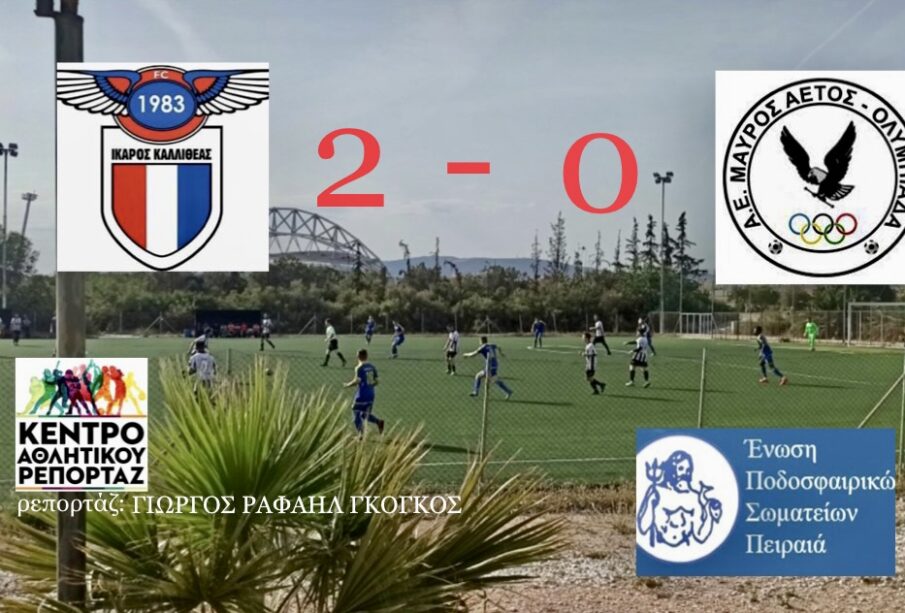 Ο Ίκαρος Καλλιθέας επικράτησε του Μαύρου Αετού Ολυμπιάδας με 2-0 στο Γήπεδο Παραλία Καλλιθέας για την 7ηαγωνιστική των Play out του 2ου ομίλου της Α΄ κατηγορίας Ε.Π.Σ Πειραιά. Οι γηπεδούχοι ήταν καλύτεροι και με γκολ των Καλέλα και Λιμήτσιου πήραν την νίκη.