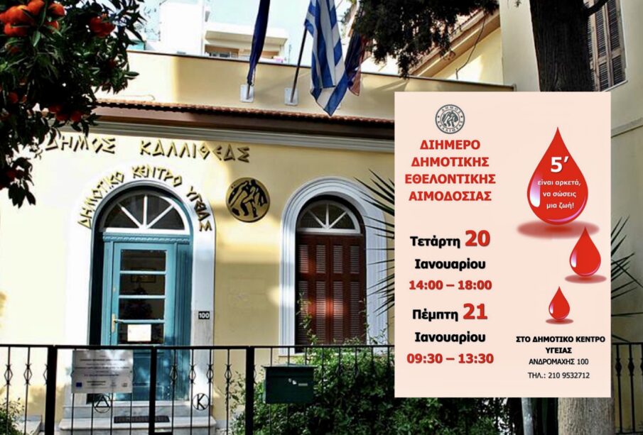 Διήμερο Δημοτικής Εθελοντικής Αιμοδοσίας διοργανώνει ο Δήμος Καλλιθέας  την Τετάρτη 20 Ιανουαρίου 2021 από τις 14:00 έως 18:00 και την Πέμπτη 21 Ιανουαρίου 2021 από τις 09:30 έως 13:30 στο Δημοτικό Κέντρο Υγείας (Ανδρομάχης 100, τηλ. 210.95.32.712).