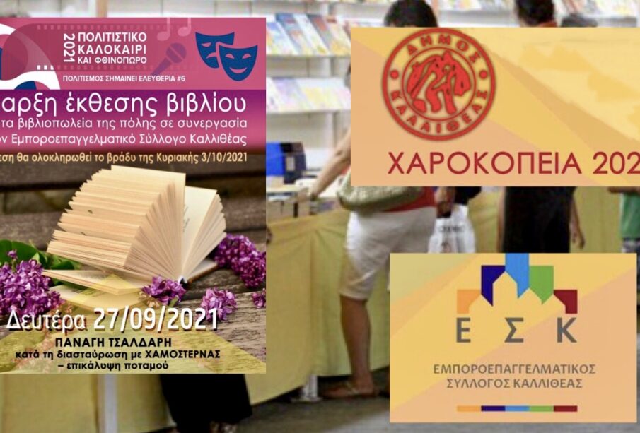 Ο Δήμος Καλλιθέας σε συνεργασία με τον Εμποροεπαγγελματικό Σύλλογο Καλλιθέας (ΕΣΚ) διοργανώνει έκθεση βιβλίου με τη συμμετοχή των βιβλιοπωλείων της Καλλιθέας η οποία ξεκίνησε σήμερα Δευτέρα 27 Σεπτεμβρίου 2021 και θα παραμείνει μέχρι την Κυριακή 3 Οκτωβρίου 2021 στην οδό Παναγή Τσαλδάρη κατά τη διασταύρωση με Χαμοστέρνας – επικάλυψη ποταμού.