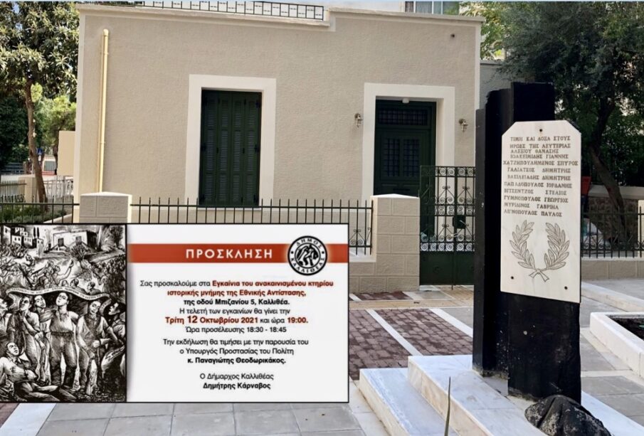 Ιστορική ημέρα σήμερα (Τρίτη 12 Οκτωβρίου 2021) για την πόλη της Καλλιθέας καθώς στις 19:00 θα πραγματοποιηθούν τα εγκαίνια του ανακαινισμένου κτηρίου ιστορικής μνήμης της Εθνικής Αντίστασης που βρίσκεται επί της οδού Μπιζανίου.