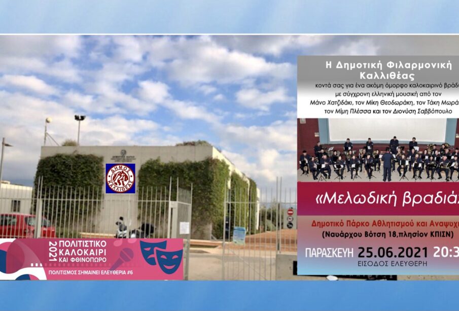 Στο Δημοτικό Πάρκο η Δημοτική Φιλαρμονική Καλλιθέας  σε ένα  όμορφο και ηλιοφέγγαρο καλοκαιρινό βράδυ θα ταξιδέψει τους φίλους της στη σύγχρονη ελληνική μουσική από τον Μάνο Χατζηδάκι, τον Μίκη Θεοδωράκη, τον Τάκη Μωράκη, τον Μίμη Πλέσσα και τον Διονύση Σαββόπουλο.
