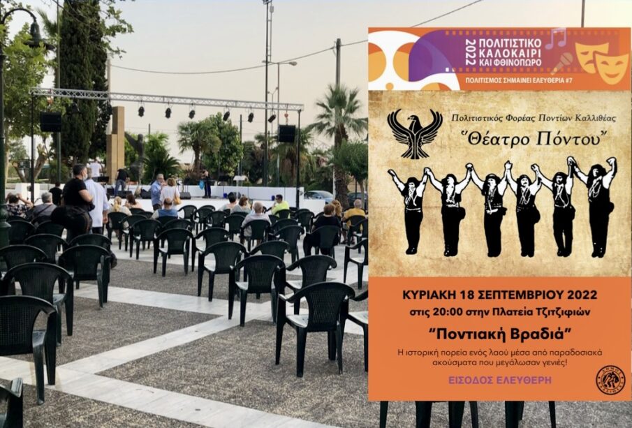 Με χορούς και τραγούδια από τον Πόντο συνεχίζει το φθινοπωρινό του ταξίδι το πρόγραμμα «Πολιτιστικό Καλοκαίρι και Φθινόπωρο 2022» του Δήμου Καλλιθέας.