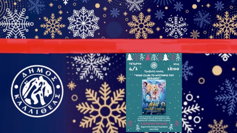 Οι γιορτινές προβολές ταινιών στο Δημοτικό Κινηματογράφο «Καλυψώ» συνεχίζονται σήμερα Τετάρτη 4 Ιανουαρίου 2023 στις 18:00 με την προβολή της ταινίας «Winx Club: Το Μυστήριο του Ωκεανού».
