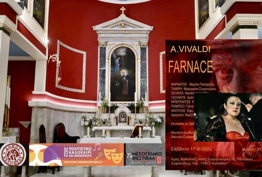 Κορυφαία στιγμή για το 7ο Μεσογειακό Φεστιβάλ Καλλιθέας η παρουσίαση για πρώτη φορά στην Ελλάδα της όπερας του Αντόνιο Βιβάλντι «Ο Φαρνάκης», σε μορφή αναλογίου που θα δοθεί απόψε, Σάββατο 17 Σεπτεμβρίου 2022, στο χώρο της Καθολικής Εκκλησίας Καλλιθέας, στις 20:30, με την ευγενική αρωγή της ενορίας.