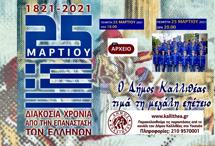 Σήμερα Πέμπτη 25 Μαρτίου 2021 συμπληρώνονται 200 χρόνια από την ιστορική στιγμή της Επανάστασης των Ελλήνων και ο Δήμος Καλλιθέας ξεκινά την 3η ημέρα των Επετειακών Εκδηλώσεων στις 18:00 με την προβολή του ντοκιμαντέρ «1821, η πορεία προς τη μεγάλη στιγμή» από το Αρχείο της ΕΡΤ. Η προβολή του θα γίνει από το κανάλι του Δήμου στο YouTube.
