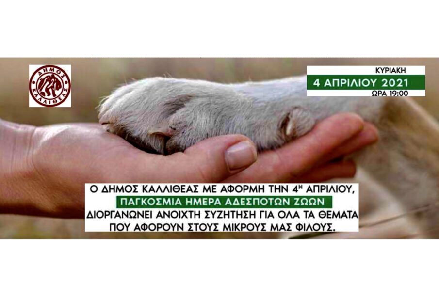 4η Απριλίου, Παγκόσμια Ημέρα Αδέσποτων Ζώων, και ο Δήμος Καλλιθέας διοργανώνει, μέσω της ψηφιακής πλατφόρμας που διαθέτει, ανοιχτή συζήτηση για όλα τα θέματα που αφορούν στους τετράποδους φίλους μας.
