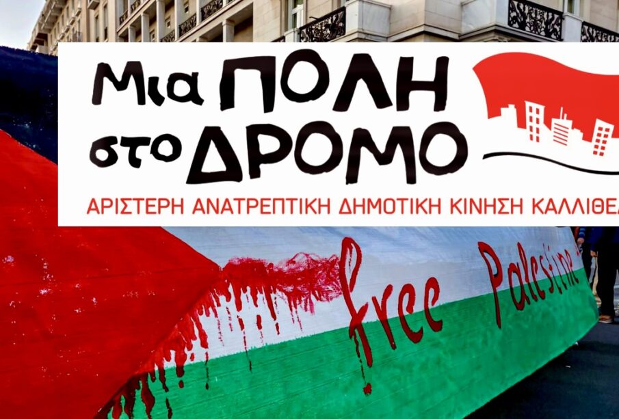 Την παρουσία της αστυνομίας στο Δημαρχείο Καλλιθέας όπου απαίτησε να κατέβει πανό, που είχε τοποθετηθεί με αναφορά στην αλληλεγγύη για τον Παλαιστινιακό λαό, καταδικάζει με ανακοίνωση της η Αριστερή Ανατρεπτική Δημοτική Κίνηση Καλλιθέας «Μια Πόλη στο Δρόμο».