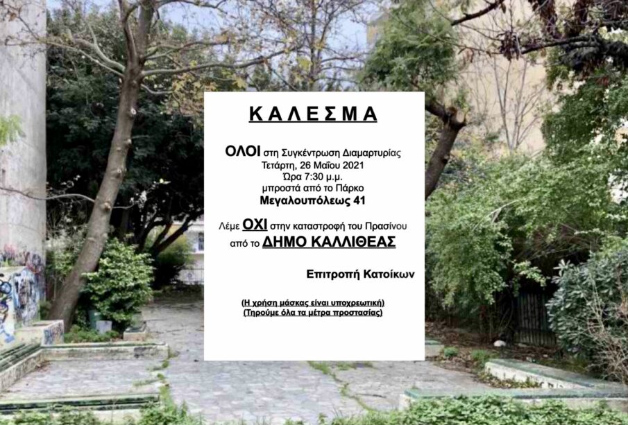 Πιο συγκεκριμένα η επιτροπή κατοίκων της περιοχής καλεί σε συγκέντρωση διαμαρτυρίας την Τετάρτη 26 Μαΐου 2021 στις 19:30 με σκοπό την κλιμάκωση των ενεργειών τους έτσι ώστε η διοίκηση του Δήμου Καλλιθέας να αλλάξει την αρχική της απόφαση και να εγκαταστήσει τις αίθουσες σε άλλους χώρους διαμορφώνοντας παράλληλα και πάλι το συγκεκριμένο χώρο σε πάρκο αναψυχής.