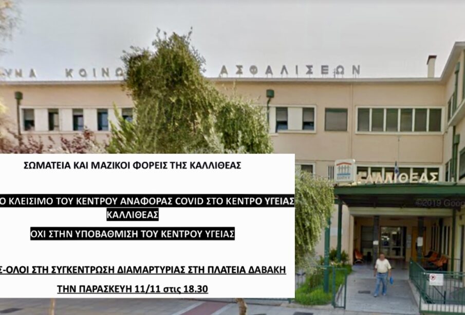 Με αίτημα την αναστολή της απόφασης για το κλείσιμο του κέντρου covid στο Κέντρο Υγείας Καλλιθέας (πρώην ΙΚΑ) σωματεία και μαζικοί φορείς της Καλλιθέας και των όμορων Δήμων πραγματοποιούν συγκέντρωση διαμαρτυρίας απόψε, Παρασκευή 11 Νοεμβρίου 2022, στις 18:30 στην Πλατεία Δαβάκη.