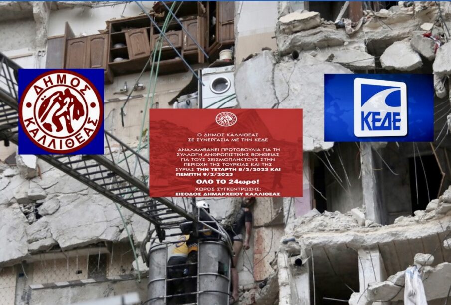 Ο Δήμος Καλλιθέας ανταποκρινόμενος στο κάλεσμα του προέδρου της Κεντρικής Ένωσης Δήμων Ελλάδας (Κ.Ε.Δ.Ε.) Δημήτρη Παπαστεργίου, για συμμετοχή των Δήμων στην εθνική προσπάθεια για την παροχή ανθρωπιστικής βοήθειας, σε συνεργασία με την Περιφερειακή Ένωση Δήμων Αττικής (Π.Ε.Δ.Α.) και την Περιφέρεια Αττικής, δια της Αντιδημαρχίας Υγείας και Κοινωνικής Προστασίας, καλεί τους κατοίκους της πόλης να προσφέρουν ανθρωπιστική βοήθεια στους σεισμόπληκτους συνανθρώπους μας στην Τουρκία και τη Συρία.