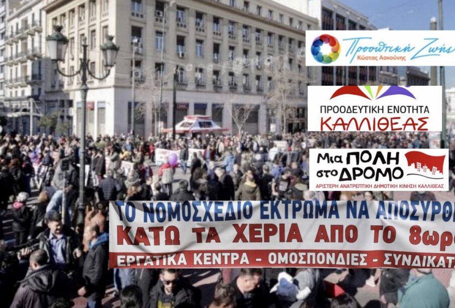 Οι δημοτικές παρατάξεις “Προοπτική Ζωής”, “Προοδευτική Ενότητα Καλλιθέας” και “Μια Πόλη στο Δρόμο” εκφράζουν την αντίθεσή τους στην απόφαση της Κυβέρνησης να νομοθετήσει νέες ρυθμίσεις στις εργασιακές σχέσεις, οι οποίες αποτελούν ευθεία επίθεση σε μακρόχρονες κατακτήσεις των εργαζομένων.