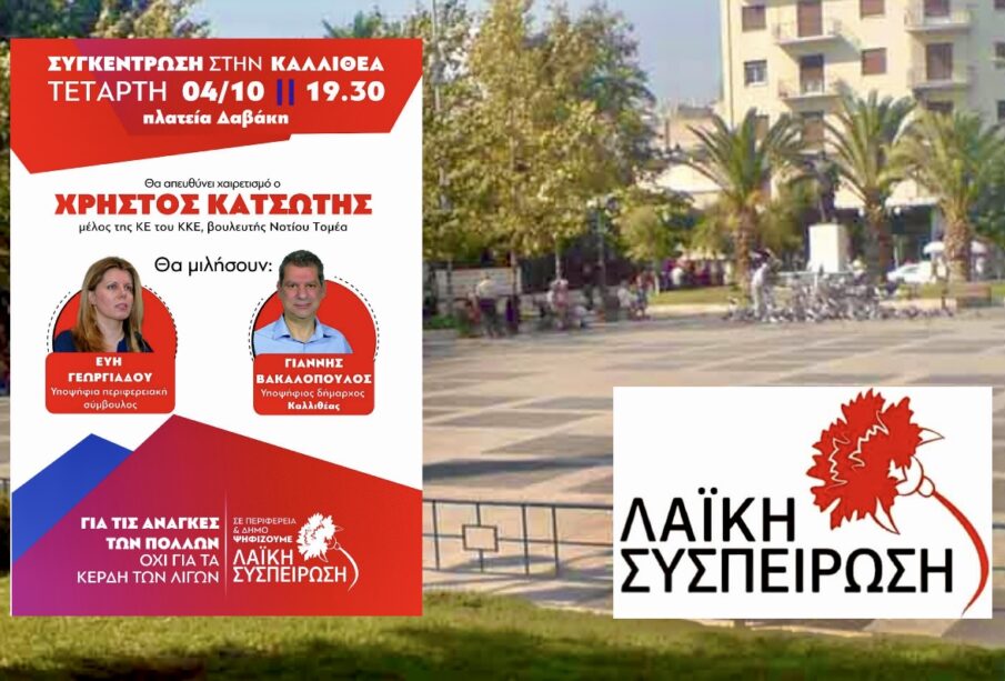 Στην ανάγκη να υπάρξουν εκλεγμένοι σύμβουλοι και Δημοτική αρχή που θα αγωνίζεται με το λαό και για τη ζωή που του ανήκει θα αναφερθούν και οι κεντρικοί ομιλητές Εύη Γεωργιάδου ,υποψήφια Περιφερειακή Σύμβουλος, και Γιάννης Βακαλόπουλος, υποψήφιος Δήμαρχος Καλλιθέας στην συγκέντρωση που διοργανώνει η «Λαϊκή Συσπείρωση» την Τετάρτη 4 Οκτωβρίου 2023 στην Πλατεία Δαβάκη στις 19:30.