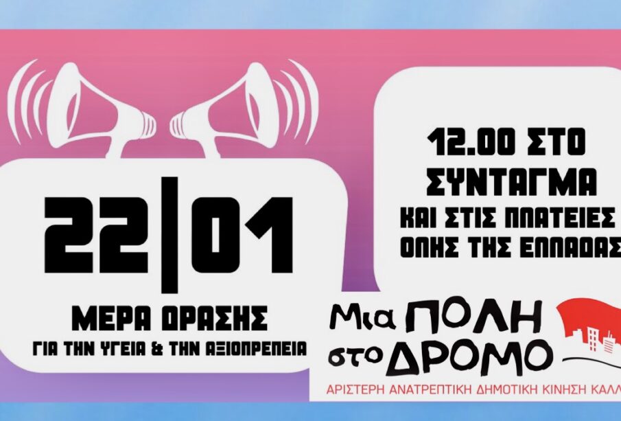 Καλούμε όλες τις δυνάμεις του κινήματος, σωματεία και συνδικάτα, φοιτητικούς συλλόγους, τοπικές /δημοτικές κινήσεις, δομές αλληλεγγύης, κάθε κοινωνική συλλογικότητα και όλα τα κοινωνικά στρώματα που πλήττονται και αναζητούν δρόμους συλλογικού αγώνα, να δώσουμε από κοινού αυτή τη μάχη. Με πολύμορφες δράσεις σε κάθε πόλη και γειτονιά και ένα κεντρικό μαζικό ραντεβού σε μια Μέρα Δράσης για την Υγεία και την Αξιοπρέπεια.
