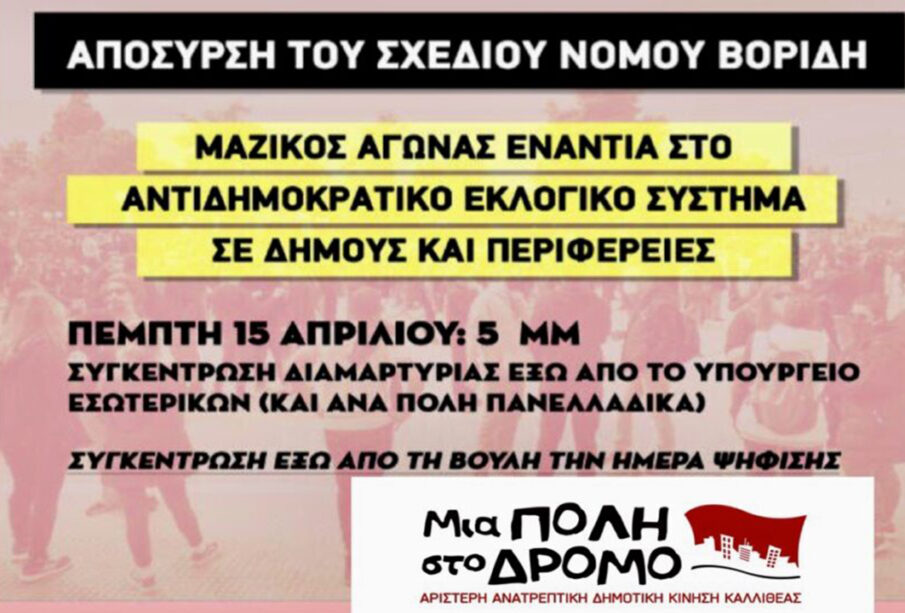 Σε μαζικό αγώνα με αίτημα την απόσυρση του σχεδίου νόμου που προωθεί ο υπουργός Εσωτερικών, Μάκης Βορίδης, για το εκλογικό σύστημα ανάδειξης των δημοτικών συμβουλίων, καλούν δημοτικές παρατάξεις από όλη την Ελλάδα, μεταξύ των οποίων και η δημοτική παράταξη “Μια Πόλη στο Δρόμο“.