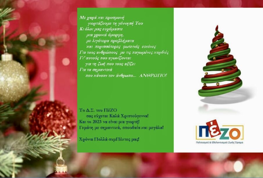 Ο Πολιτιστικός μας «ΠέΖΟ» που έχει μπει δυναμικά στην πολιτιστική μας καθημερινότητα, και όχι μόνο, εύχεται σε όλους μας για τις γιορτές και το νέο έτος.