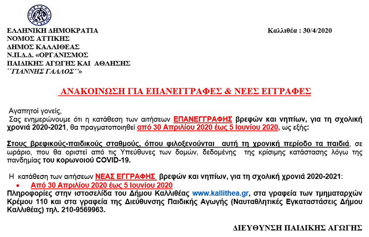 ΟΠΑΑ «Γιάννης Γάλλος»: 30 Απριλίου-5 Ιουνίου επανεγγραφές και νέες εγγραφές βρεφών & νηπίων…