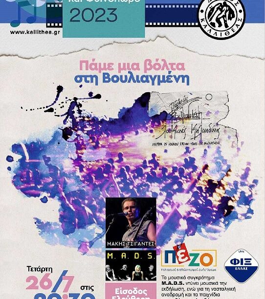 Και ξαφνικά πέφτει στην πολιτιστική σκακιέρα της πόλης μας της Καλλιθέας η κίνηση ματ του συλλόγου ΠΕΖΟ. Στα 40 χρόνια από την Βουλιαγμένη στον όμορφο χώρο που δημιούργησε η επικάλυψη του Ιλισού (διασταύρωση Φιλαρέτου και Π. Τσαλδάρη) θα αναβιώσουν τα τραγούδια του Λουκιανού και κατ αναλογία η συγκίνηση από τη θύμηση για τους μεγαλύτερους, η χαρά για τους νεότερους,η δροσιά για όλους μας από τα μουσικά ακούσματα του συγκροτήματος M.A.D.S .