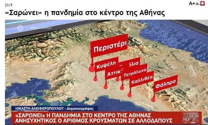 Σοκ προκαλεί η έρευνα που παρουσίασε ο δημοσιογράφος Νίκος Ευαγγελάτος στο δελτίο ειδήσεων με τίτλο Mega Live news στις 16:00 σήμερα Δευτέρα 21 Σεπτεμβρίου όπου αποκάλυψε πως η περιοχή της Καλλιθέας βρίσκεται στα κόκκινα λόγω Covid-19. Ο έγκριτος δημοσιογράφος επικαλούμενος έρευνα του δημοσιογραφικού του επιτελείου, και πιο συγκεκριμένα της Ιοκάστης Αλειφεροπούλου, ανέφερε ότι επιβεβαιωμένα στοιχεία αναφέρουν ποιες περιοχές είναι στο κόκκινο και ανησυχούν ιδιαίτερα την κυβέρνηση, η οποία οδηγείται σε ακόμη πιο σκληρά μέτρα.