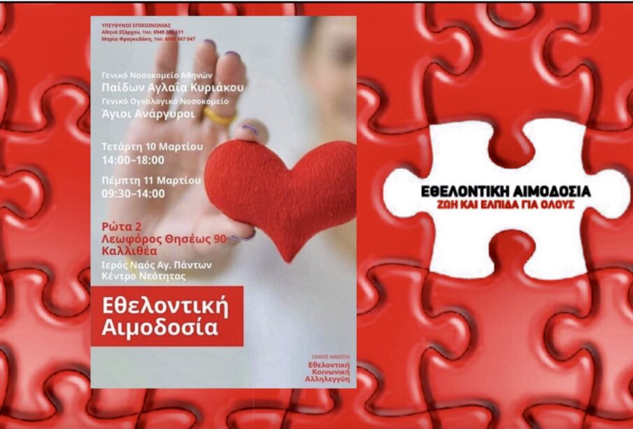 Μια ακόμη ευκαιρία για εθελοντική προσφορά αίματος μας δίνει και ο Σύλλογος Αιμοδοτών “Εθελοντική Κοινωνική Αλληλεγγύη” με το διήμερο Εθελοντικής Αιμοδοσίας που διοργανώνει σε συνεργασία με το ΓΝΑ Παίδων “Αγλαΐα Κυριακού” και το Γενικό Ογκολογικό Νοσοκομείο “Άγιοι Ανάργυροι“.