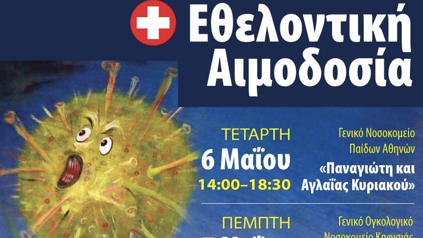 Σε εθελοντική αιμοδοσία προχωρά ο Σύλλογος Αιμοδοτών «Εθελοντική Κοινωνική Αλληλεγγύη», μέλος της Πανελλήνιας Ομοσπονδίας Συλλόγων Εθελοντών Αιμοδοτών (ΠΟΣΕΑ), σε συνεργασία με το Γενικό Νοσοκομείο Παίδων «Παναγιώτη και Αγλαΐας Κυριακού» την Τετάρτη 6 Μαίου και από τις 14:00 έως 18:30, καθώς και με το Γενικό Ογκολογικό Νοσοκομείο Κηφισιάς «Οι Άγιοι Ανάργυροι» τη Πέμπτη 7 Μαίου και από τις 09:30 έως 14:00.