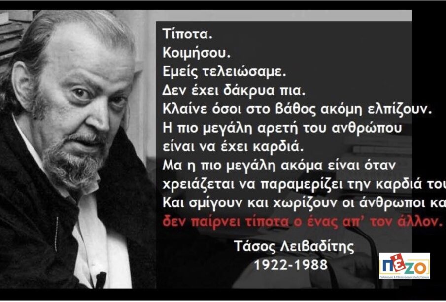 Αγαπημένε ποιητή Τάσο Λειβαδίτη, σε ευχαριστούμε που μάθαμε από εσένα, να πολεμάμε πάντα, στον βωμό των σκιρτημάτων της καρδιάς μας και των απέραντων χαμόγελων μικρών και μεγάλων.