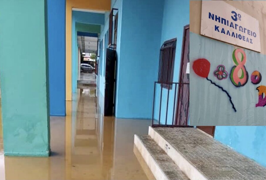«…Πάλι το 3ο Νηπιαγωγείο Καλλιθέας κλειστό και με ζημιές από τη χθεσινοβραδινή βροχή. Πάλι μόνες τους οι δασκάλες να καθαρίζουν, άγνωστο πότε θα ξανανοίξει.