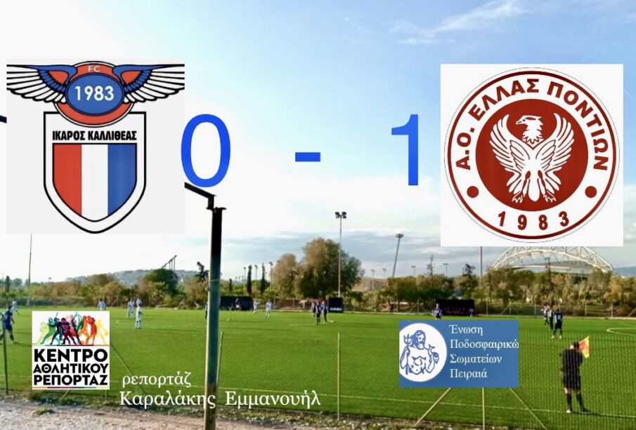 Η Ελλάς Ποντίων επικράτησε 1 – 0 του Ικάρου Καλλιθέας στην αναμέτρηση που διεξήχθη στο γήπεδο Παραλίας Καλλιθέας στο πλαίσιο της 7ης αγωνιστικής του 2ου Ομίλου της Α’ Κατηγορίας της Ε. Π. Σ. Πειραιά. Η εν λόγω αναμέτρηση είχε εκ προοιμίου υψηλό διακύβευμα μια και επρόκειτο για δύο εκ των ομάδων που διεκδικούν επί ίσοις όροις τα πρωτεία στο φετινό πρωτάθλημα και δεσπόζουν με τις μέχρι τώρα εμφανίσεις τους. Το παιχνίδι ήταν καθόλα ισορροπημένο στο μεγαλύτερο μέρος του, με λιγοστές ευκαιρίες εκατέρωθεν, αλλά με την Ελλάς Ποντίων να είναι αυτή που κατόρθωσε στο 83′ να σημειώνει το γκολ της νίκης και να συνεχίσει ακάθεκτη την εκπληκτική πορεία της.