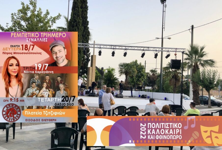 Πιο συγκεκριμένα ο Δήμος Καλλιθέας στο πλαίσιο του προγράμματος «Πολιτιστικό Καλοκαίρι – Φθινόπωρο 2022» διοργανώνει τριήμερο αφιέρωμα στο ρεμπέτικο τραγούδι το οποίο ξεκινάει σήμερα Δευτέρα 18 Ιουλίου 2022 και ολοκληρώνεται την Τετάρτη 20 Ιουλίου 2022 στην πλατεία Τζιτζιφιών.