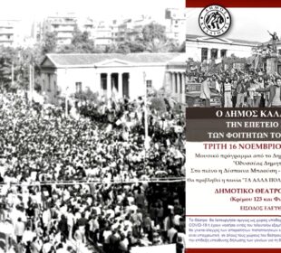 Στο “Πολυτεχνείο” της σύγχρονης εποχής που είναι ο καθημερινός αγώνας για την προστασία της ανθρώπινης ζωής και της δημόσιας υγείας, η προάσπιση ...Δ. Καλλιθέας: Εκδήλωση για την επέτειο εξέγερσης του Πολυτεχνείου σήμερα 16/11 στο Δημ. Θέατρο