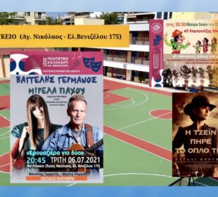 Μπροστά σε ένα αποτρόπαιο θέαμα βρέθηκαν το βράδυ της Τρίτης αστυνομικοί στην Καλλιθέα, καθώς -σύμφωνα με τις πληροφορίες- εντόπισαν μέσα σε διαμέρισμα ...Δ. Καλλιθέας: Τρίτη 6/7 Συναυλία Βαγγέλη Γερμανού – Θέατρο Σκιών & Σινέ συνεχίζεται το “Πολιτιστικό ...