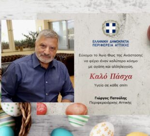 Πασχαλινές ευχές από τον Περιφερειάρχη Αττικής Γιώργο Πατούλη ο οποίος στο μήνυμα του αναφέρει: «Εύχομαι το Άγιο Φως της Ανάστασης να φέρει ...Ευχές του Βασίλη Σπανάκη Βουλευτή Νοτίου Τομέα Αθηνών