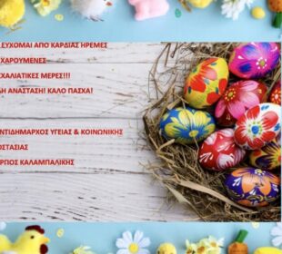 Ήρεμες και χαρούμενες Πασχαλιάτικες ημέρες για καλή Ανάσταση και Καλό Πάσχα είναι το Πασχαλινό μήνυμα του Αντιδημάρχου Υγείας και Κοινωνικής Προστασίας του ...Φωτεινές ευχές από τον ιστορικό Γ.Σ. Καλλιθέα