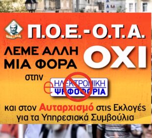 Μια σημαντική ανατροπή στο σύστημα διακυβέρνησης των Δήμων, που ελάχιστα έχει απασχολήσει το δημόσιο διάλογο, φέρνει το εκλογικό Νομοσχέδιο της Κυβέρνησης, η διαβούλευση του ...ΠΟΕ – ΟΤΑ: Λέμε ΟΧΙ στην ηλεκτρονική ψηφοφορία